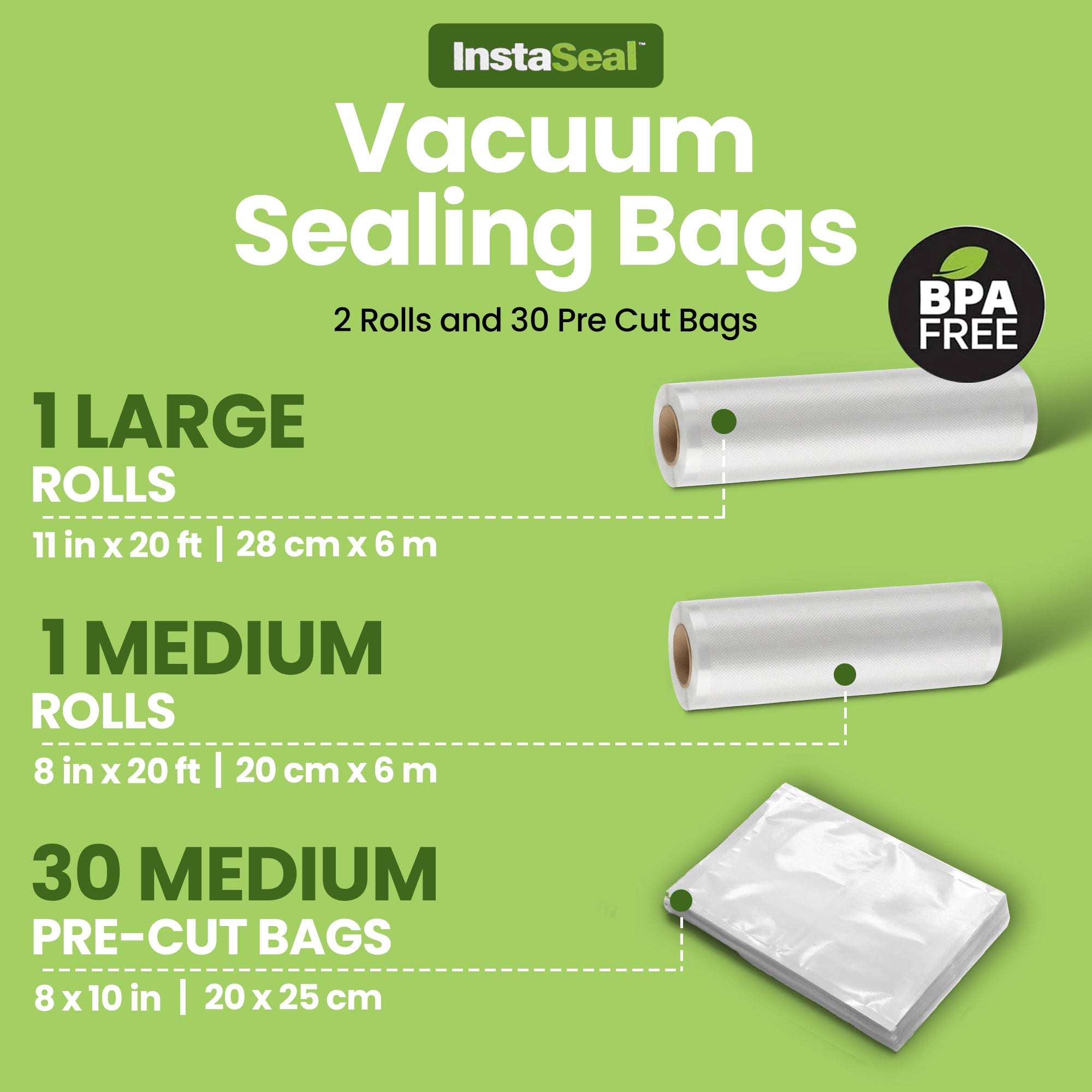 - InstaSeal Replacement Vacuum Seal Bags: Includes 1 roll (8 in x 20 ft), 1 roll (11 in x 20 ft), and 30 pre-cut vacuum seal bags.