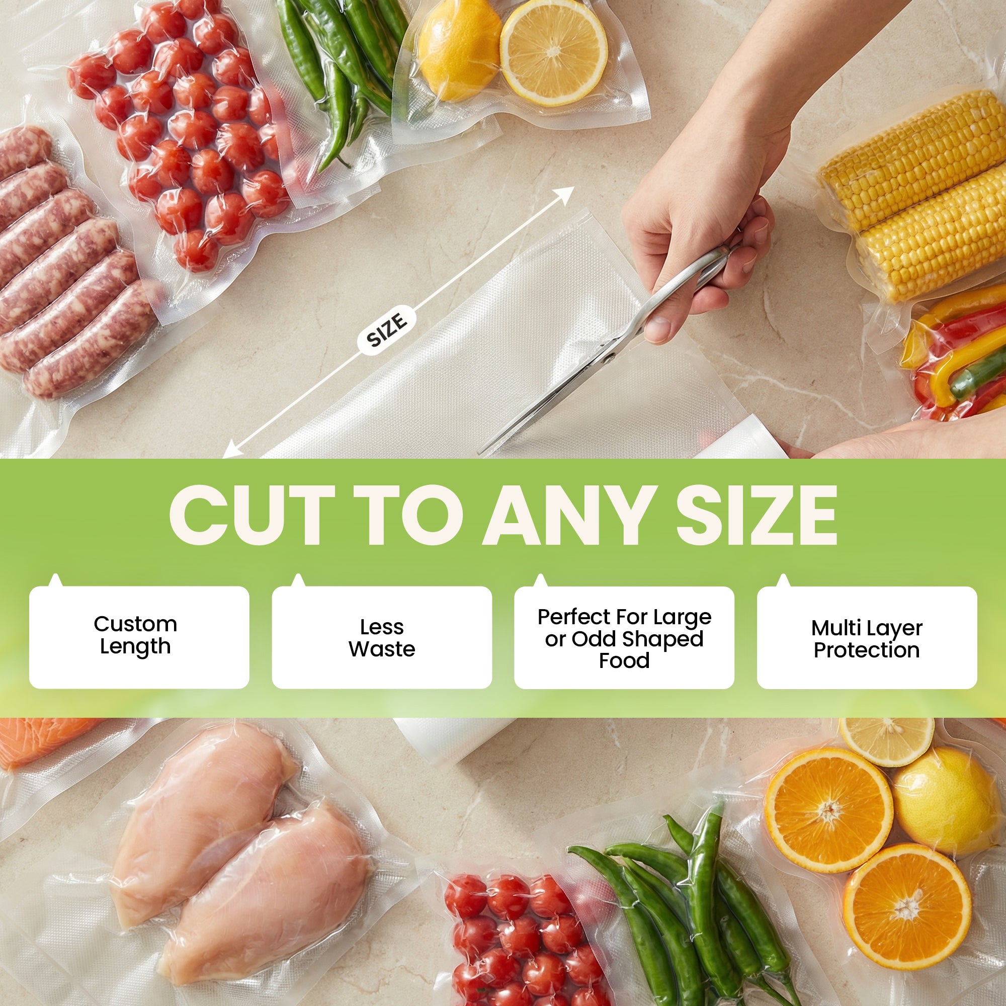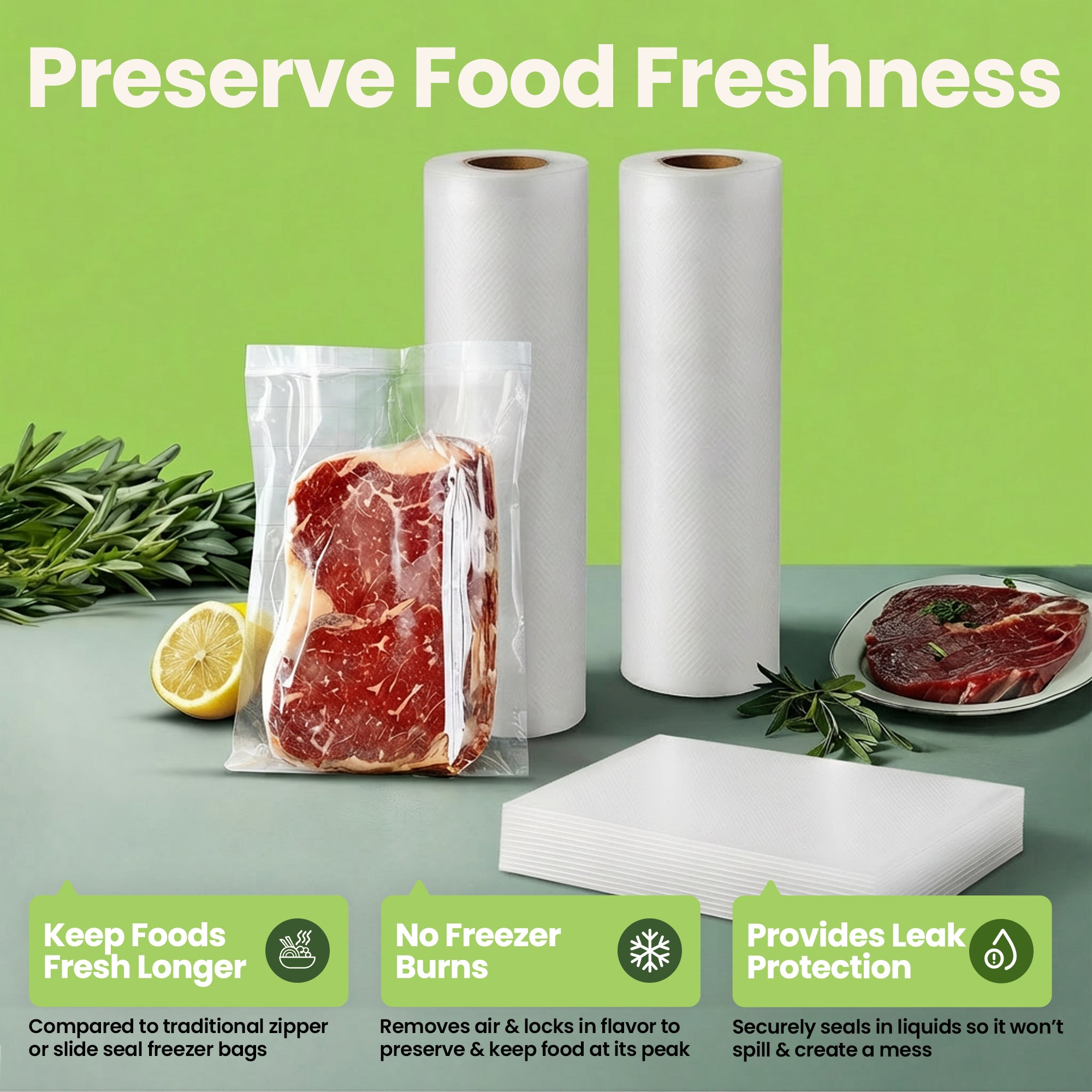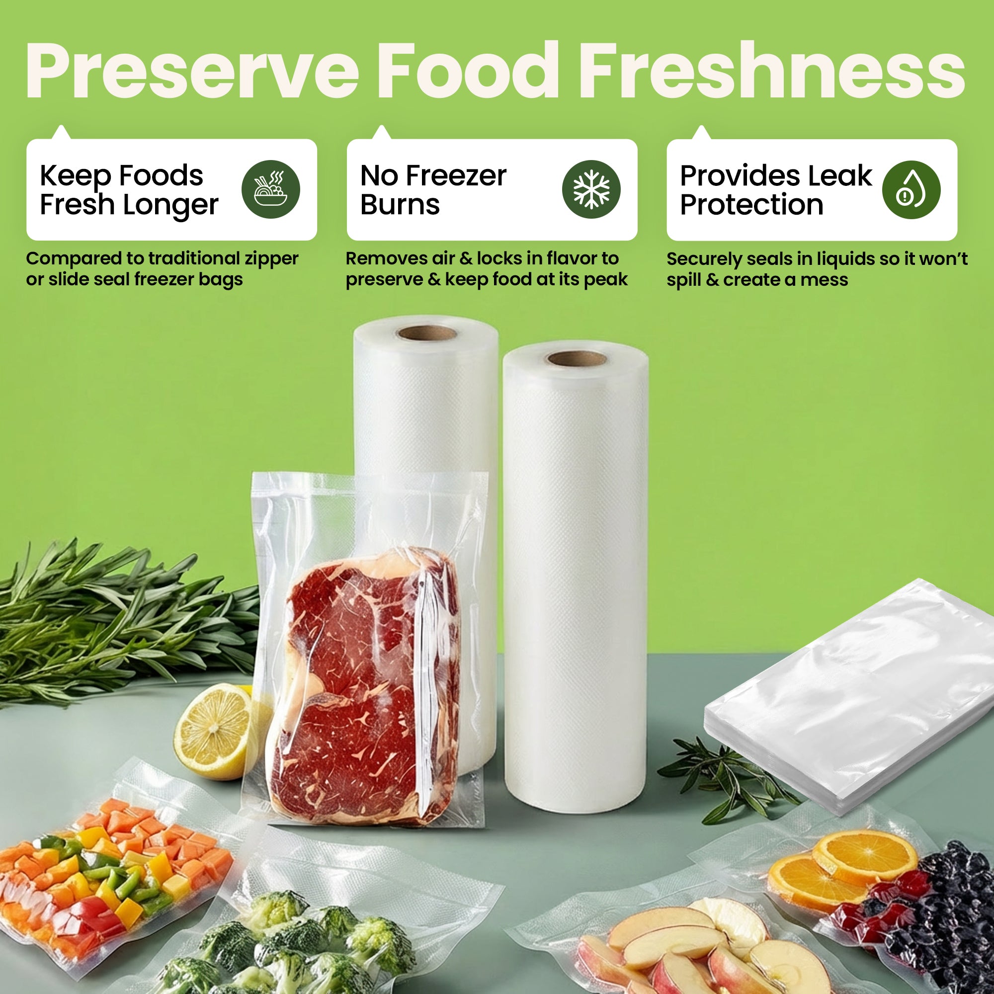 - Prevents Freezer Burn: Removes air and creates an airtight seal to lock in flavor and protect food from freezer damage.