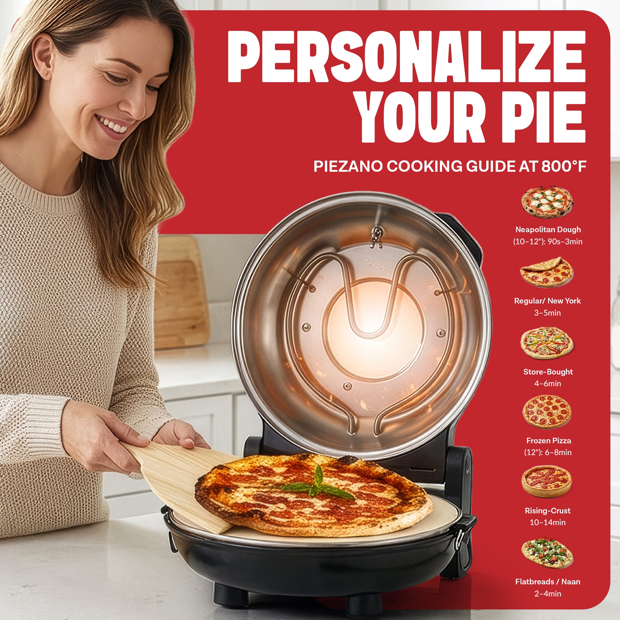 - HEATS UP TO 800˚F: Get perfectly cooked pizza in under 6 minutes! Ovens typically only go up to 450-500˚F, preventing you from achieving the crispy crust that’s a pizzeria standard. The Piezano Electric Pizza Oven takes it all the way up to 800˚F so you get great crust results every time.