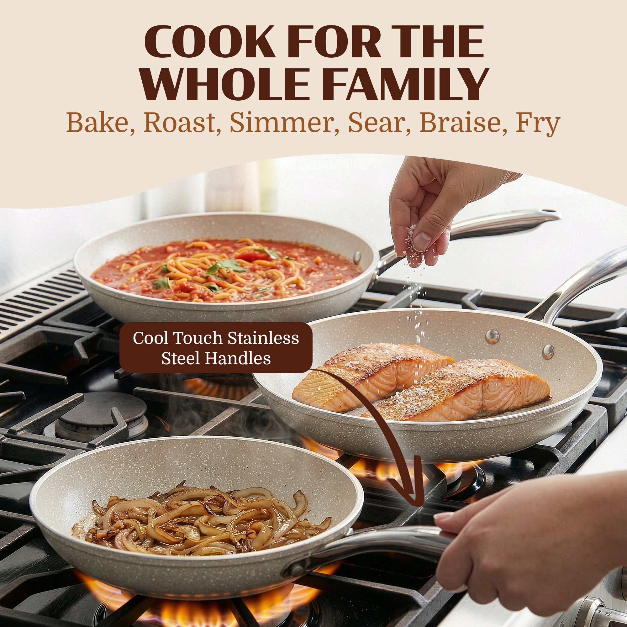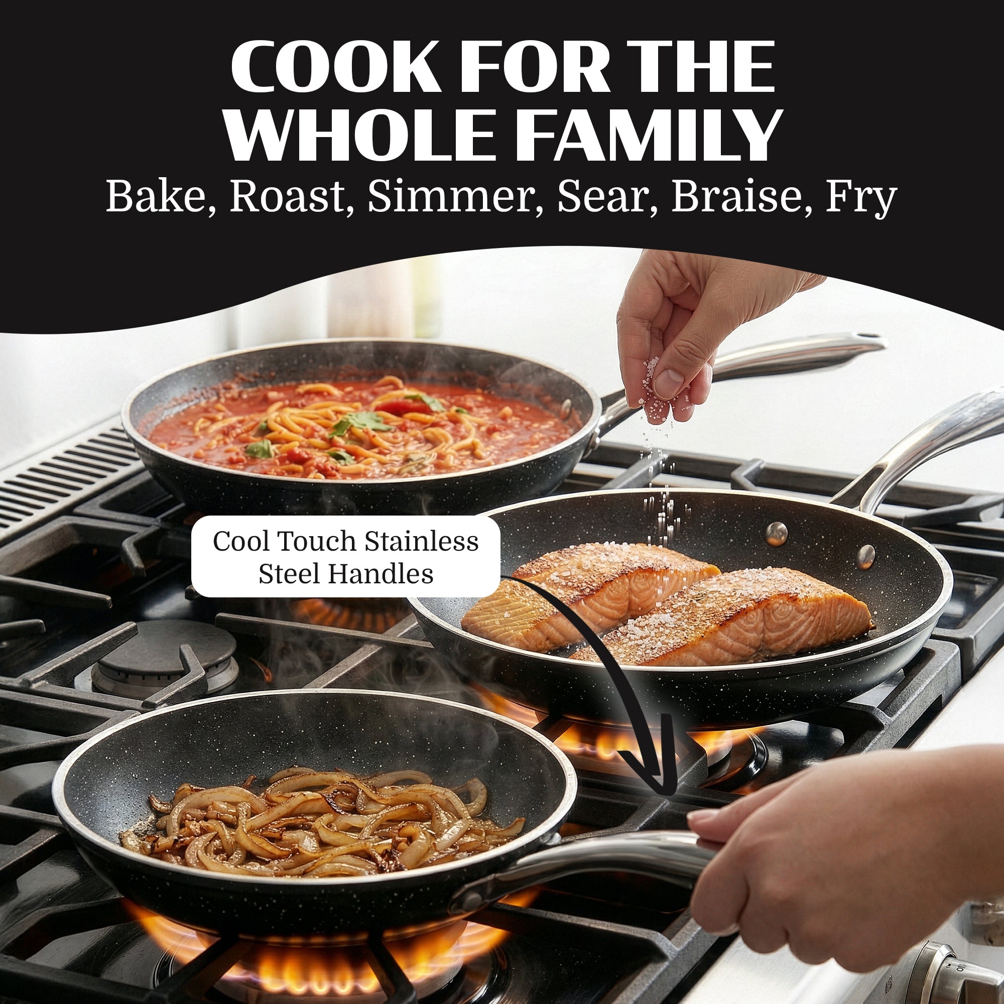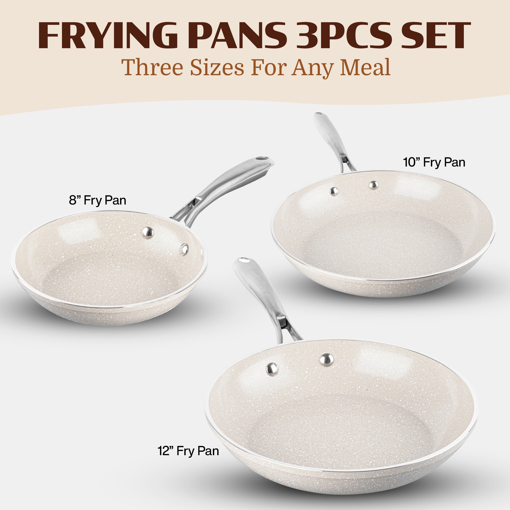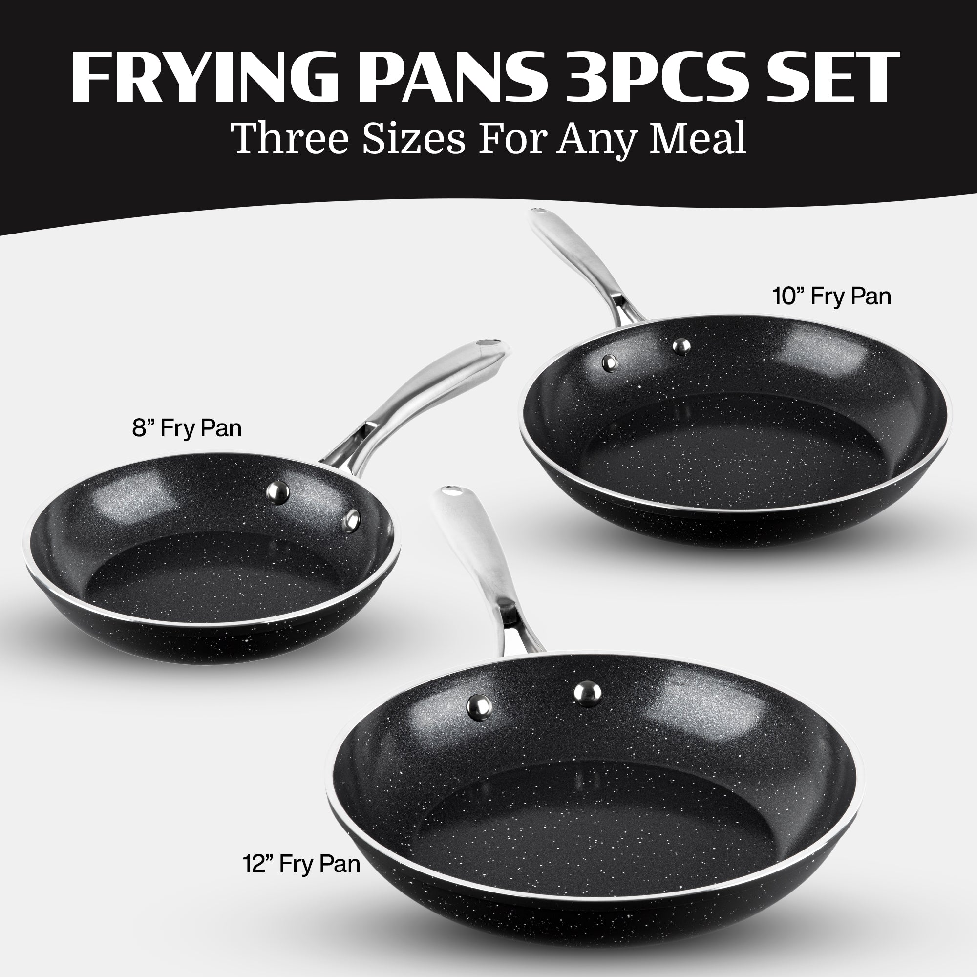 - Versatile Sizes: Includes 8", 10", and 12" skillets to handle everything from quick breakfasts to family dinners.