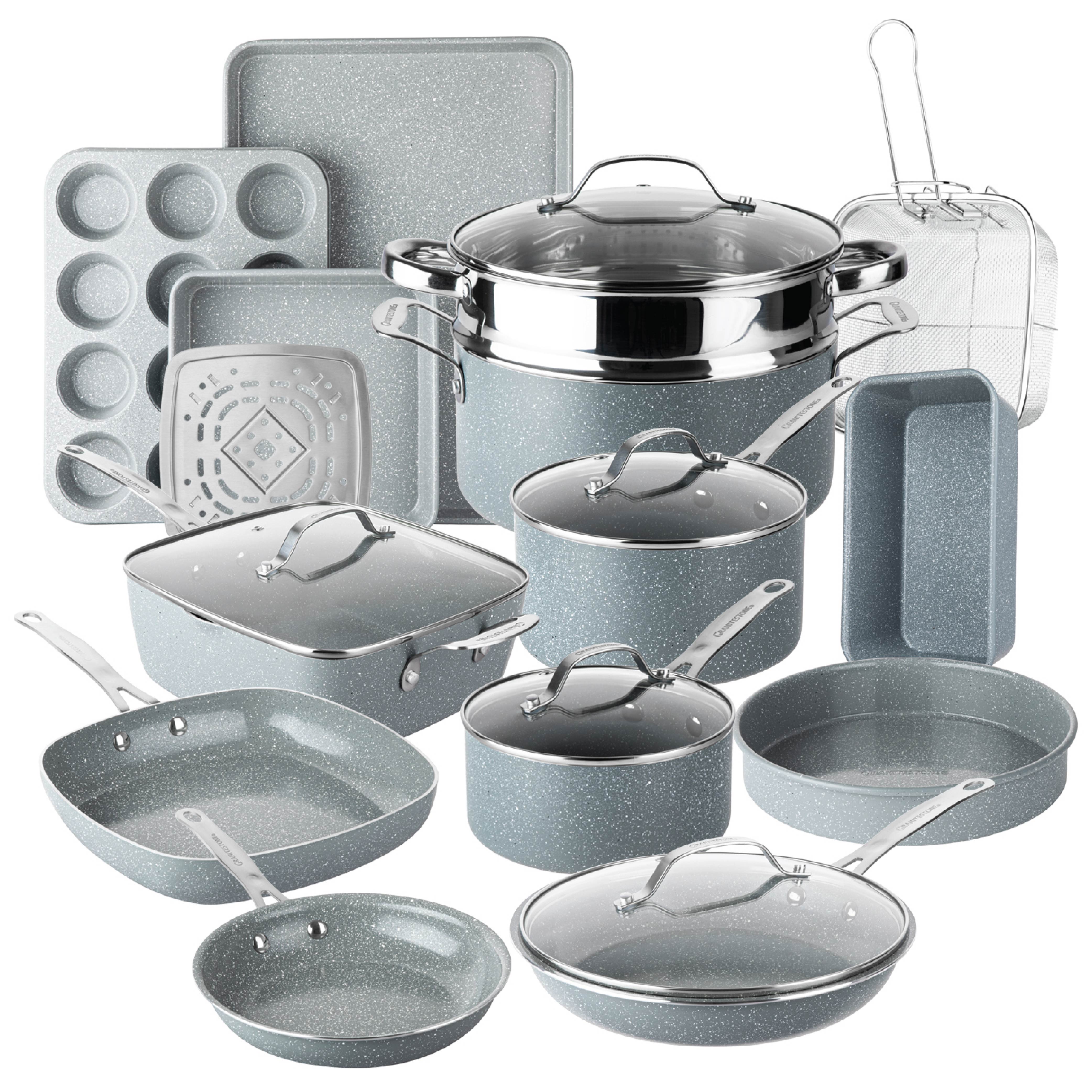 20 Piece Ceramic Cookware and Bakeware Set: 8.5" Frying Pan, 10.25" Frying Pan With Lid, 9.5" Square Pan with Lid, 1.5Qt Sauce Pan With Lid, 2.5Qt Sauce Pan With Lid, 9.5" Deep Square Pan, Fry Basket, Steamer Tray, 5 Qt Stock Pot With Lid, Steamer, Round Pan, Loaf Pan, Square Pan, Muffin Pan, Cookie Tray